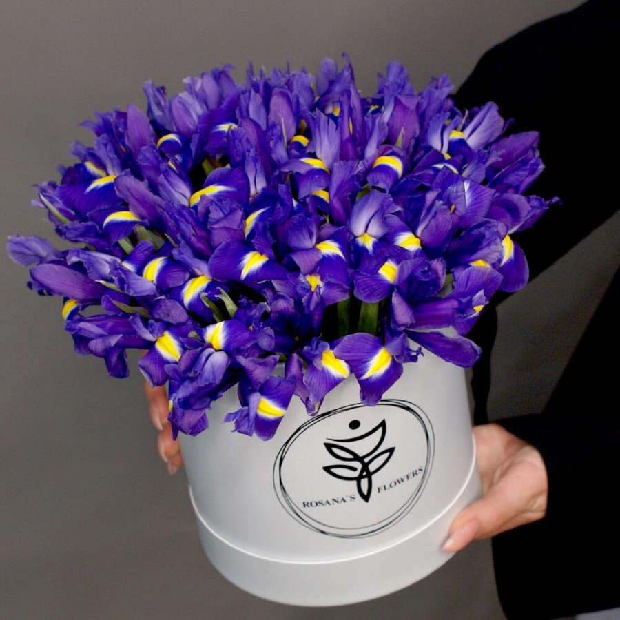 На фото 25 фиолетовых ирисов в коробке. В составе: ирис 25 шт, оазис флористический 1 шт, корзина (s) 1 шт, атласная лента 1 шт, . Все цветы свежие и ароматные, букет красиво оформлен и отлично подходит для подарка. Доступна доставка цветов или самовывоз.