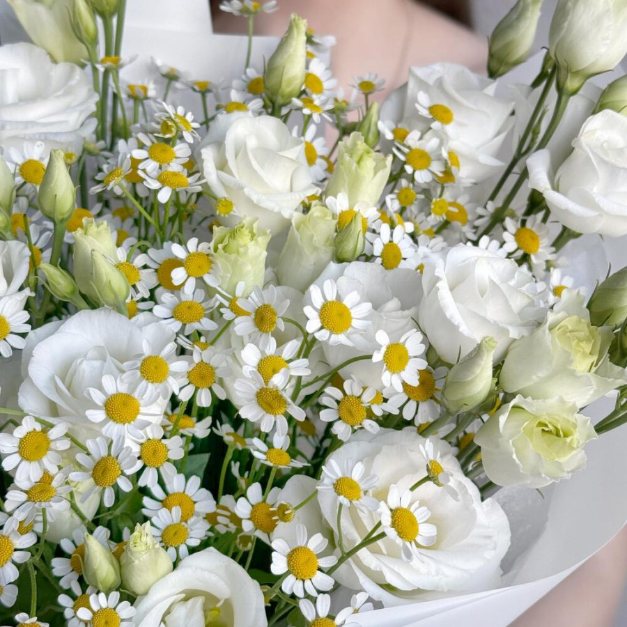 На фото букет из белых эустом и ромашки. В составе: эустома (лизиантус) 5 шт, танацетум 4 шт, дизайнерская упаковка 1 шт, атласная лента 1 шт, . Все цветы свежие и ароматные, букет красиво оформлен и отлично подходит для подарка. Доступна доставка цветов или самовывоз.