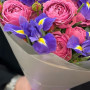 Букет из розовых пионовидных роз и синих ирисов в Воронеже