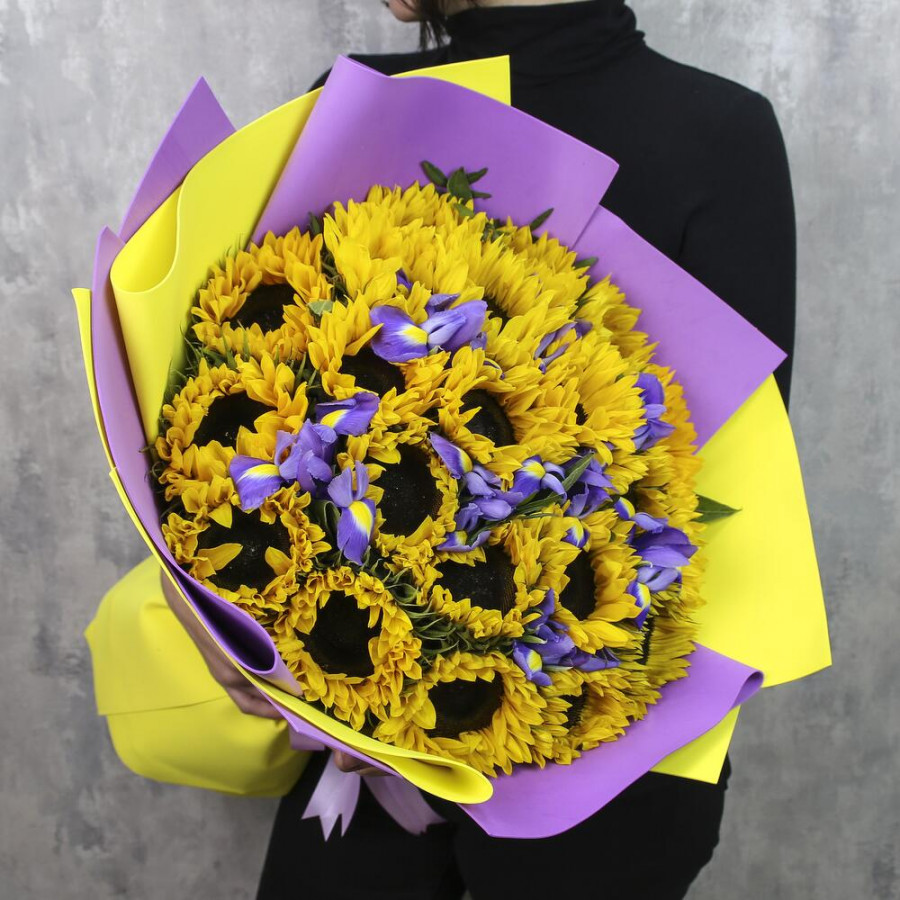 На фото букет из подсолнухов и ирисов. В составе: подсолнух 21 шт, ирис 8 шт, писташ 2 шт, дизайнерская упаковка 1 шт, атласная лента 1 шт, . Все цветы свежие и ароматные, букет красиво оформлен и отлично подходит для подарка. Доступна доставка цветов или самовывоз.