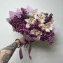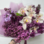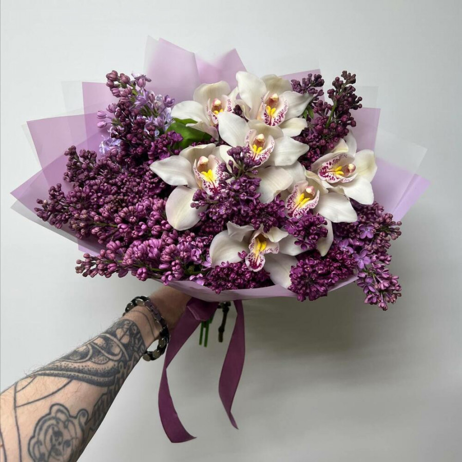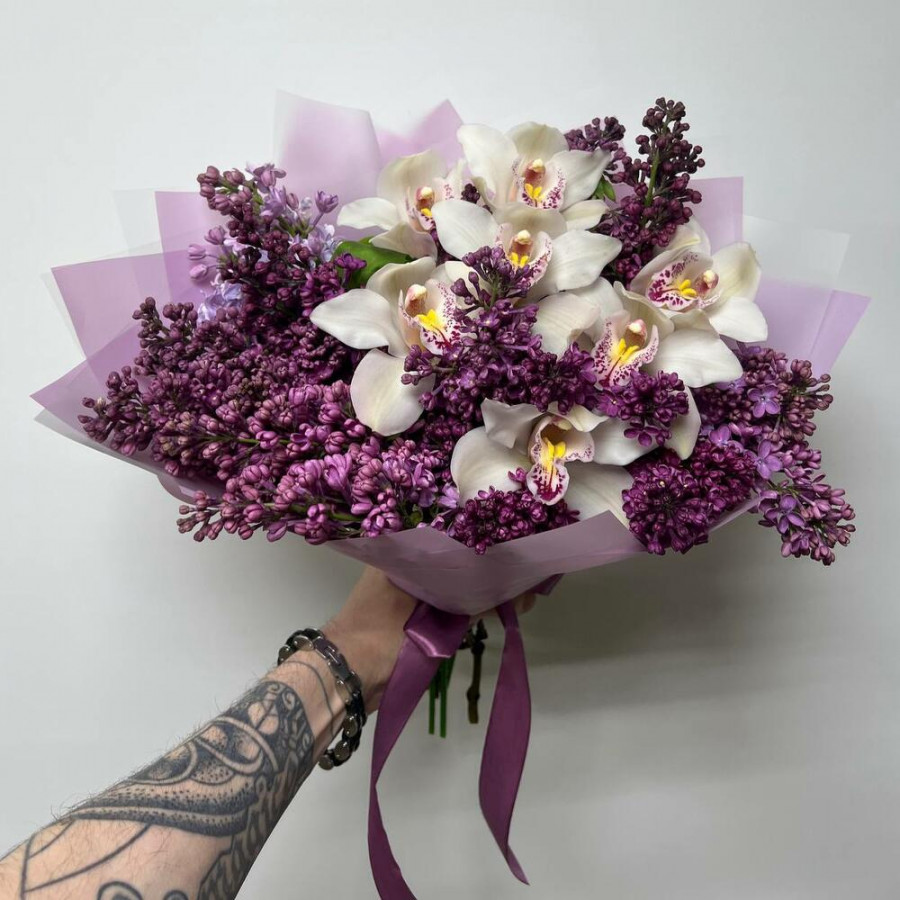 На фото букет орхидеи и сирени. В составе: сирень 5 шт, орхидея 7 шт, дизайнерская упаковка 1 шт, атласная лента 1 шт, . Все цветы свежие и ароматные, букет красиво оформлен и отлично подходит для подарка. Доступна доставка цветов или самовывоз.