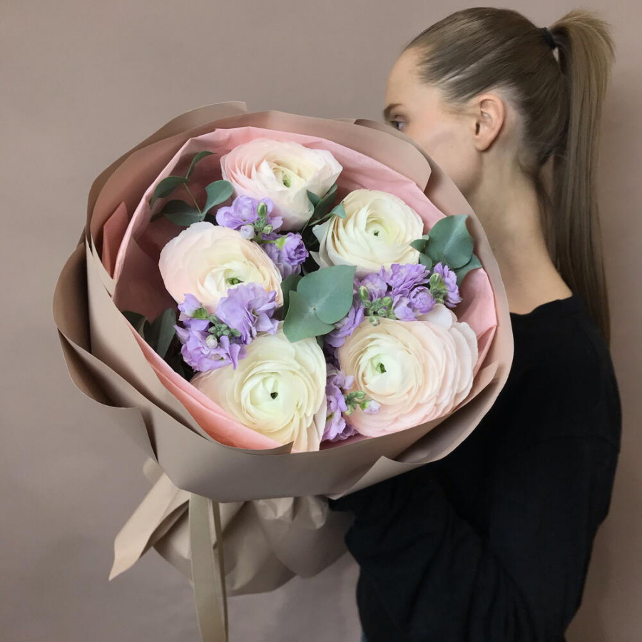 Букет из розовых ранункулюсов и сиреневой матиолы в Воронеже