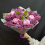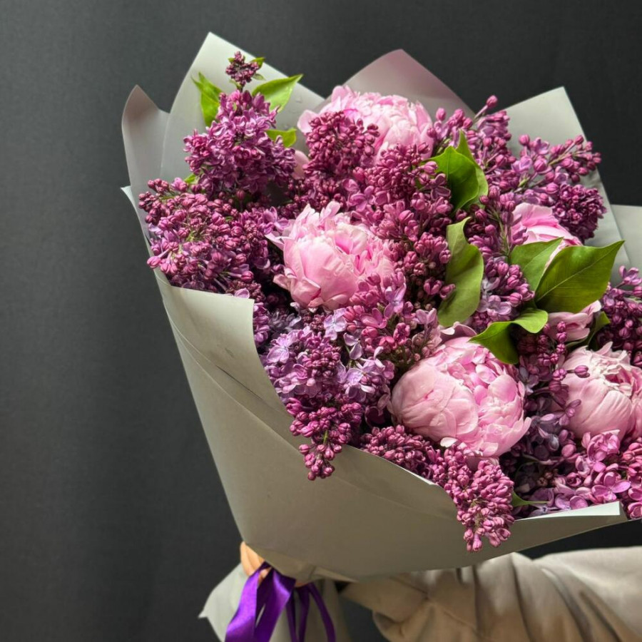 На фото букет розовых пионов с сиренью. В составе: сирень 7 шт, пион 5 шт, дизайнерская упаковка 2 шт, атласная лента 1 шт, . Все цветы свежие и ароматные, букет красиво оформлен и отлично подходит для подарка. Доступна доставка цветов или самовывоз.